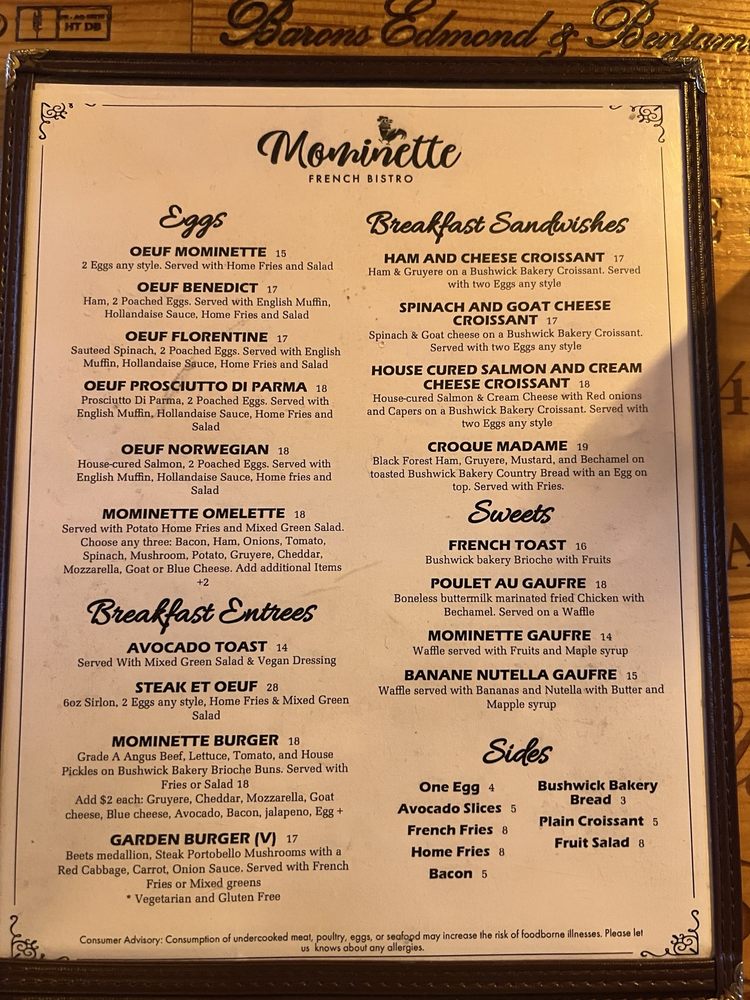 Mominette, a cozy French Bistro & Oyster Bar located in Brooklyn, offers a charming setting for breakfast and brunch. With a variety of vegan and vegetarian options, this restaurant caters to a wide range of dietary preferences. Customers rave about the must-try escargot and delectable duck confit. The intimate ambiance exudes a Parisian Brasserie vibe, perfect for a romantic date or casual brunch with friends. The restaurant's impeccable service and high-quality dishes, such as the house burger and fresh oysters, leave patrons impressed and eager to return. Mominette's attention to detail, from the plastic-free packaging to the gender-neutral restrooms, showcases their commitment to providing a welcoming and sustainable dining experience. For a memorable meal in Bushwick, Mominette stands out as a top choice for food lovers and ambiance enthusiasts alike.
